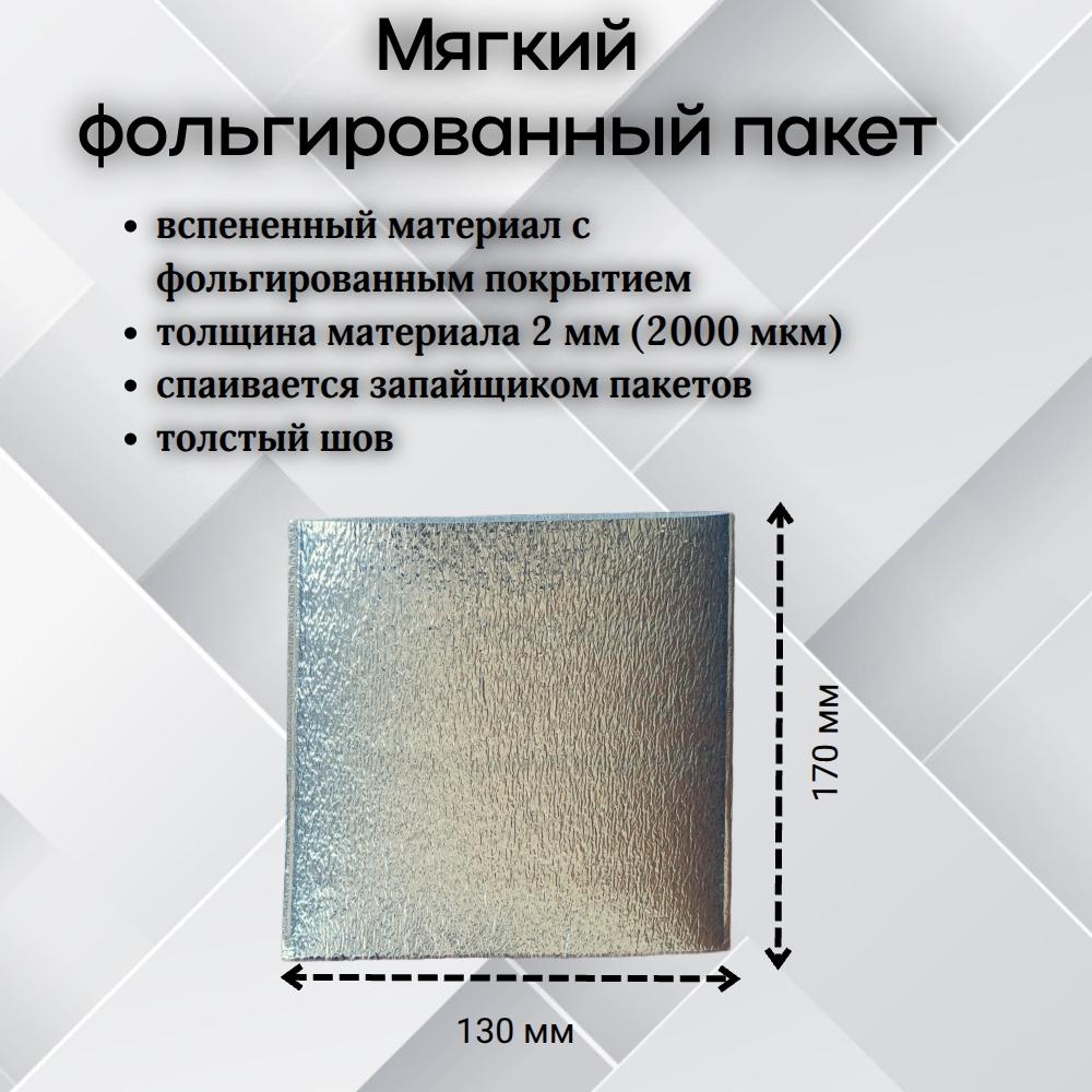Упаковка пакетов из фольгированного несшитого полиэтилена (НПЭ) толщиной 2 мм размером 130х170 мм. Открывается по ширине - 130 мм. Упаковка 100 шт.